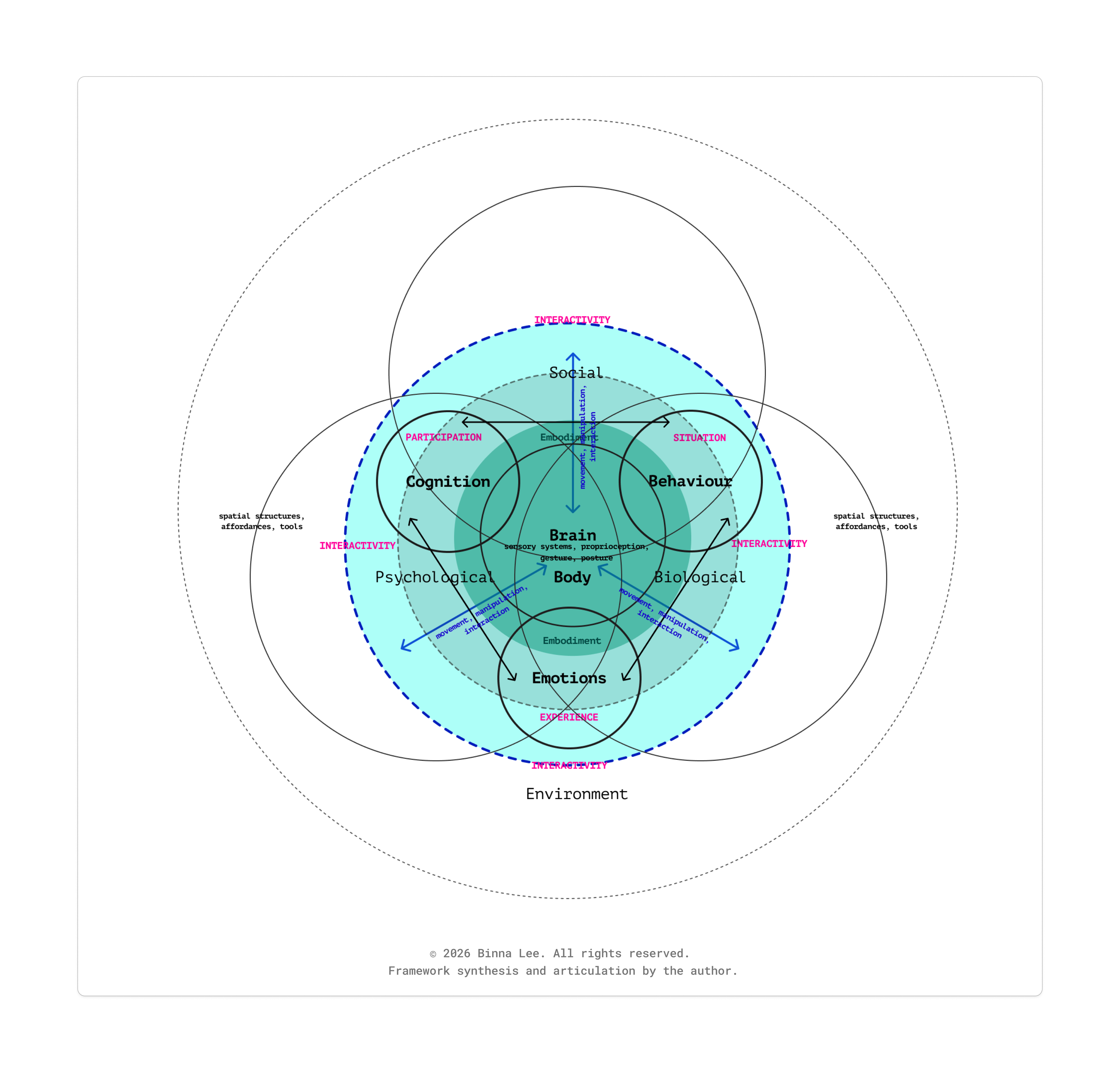 My work situates embodied cognition, spatial cognition, and experiential learning at the core of both design practice and design education. The framework draws from psychology, sociology, neuroscience, and philosophy to examine how human meaning forms through perception, interaction, and situated experience.